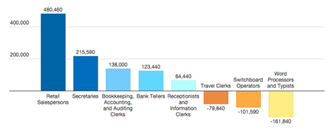 在过去10年里,零售记账人员和秘书数量增加,接线生数量减少,但前台接待数量增加。