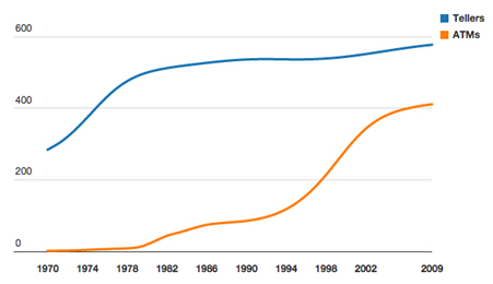 聪明的机器接手人类任务,工作机会消失,这可能看起来很明显。根据《60分钟》的报道,“银行柜员被ATM机取代,售货员向电子商务投降,电话接线生和秘书被语音识别技术取代”,但事实并非如此。ATM机并未取代银行柜员,恰恰相反,因为银行支行需要的柜员减少,银行便开设更多支行,而银行柜员的总数增加。