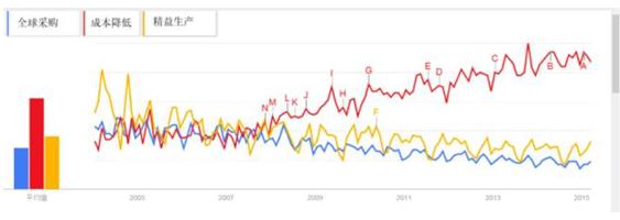 通过“谷歌趋势”统计可以了解人们在各个时间段关心的话题,数据显示,西方制造业在过去十年,首先以精益生产挖掘内部潜力,持续提升自身的成本竞争力。同时也持续进行全球采购的努力。努力降低成本始终是主话题,并且自2008年开始变得更加热烈。