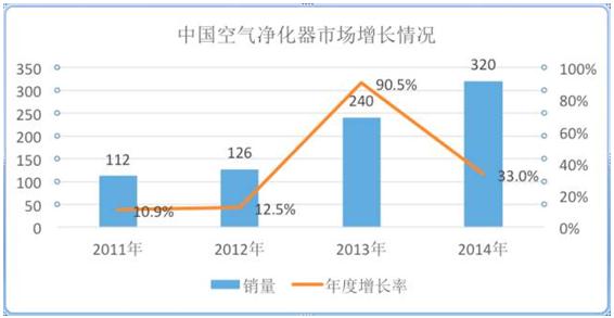与此类似的还有空气净化器的市场表现。做优质空气净化器的商家并不是突然追逐机会而研发的产品,产品早在雾霾之前就很成熟了,只是雾霾的到来引发了高度关注和断货而已。中国空气净化器市场经历了超高速的增长。2011年销量仅有112万台,而到2013年销售240万台,零售额达56亿元,2014年销量和销售额分别达到320万台和70亿元。