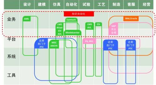 图中可见,有5类工业软件厂商。其一是PLM软件,以西门子、达索和PTC三大厂商为代表,他们基本垄断了高端装备制造CAD领域,并且凭借占有设计数据源头的优势,大力开展和强化PLM(产品全生命周期)业务,覆盖从设计、工艺到制造的环节,并通过大量并购,力求建立起完整的软件生态系统。其二是各学科领域的建模、仿真分析软件,以MSC、Ansys、LMS(已经被西门子收购)、法国ESI集团、Samtech(已被西门子收购)等为代表。其三是以iSIGHT(已被达索收购)、Model center等为代表的多学科优化和设计自动化厂商。其四是面向资源管理和项目管理的软件,比如SAP、用友、金蝶等ERP软件,以及P6(被Oracle收购)、IRIS等软件。其五是通用中间件软件,主要解决管理信息系统的集成问题,如IBM、Oracle等。