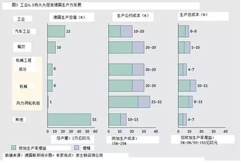 生产力方面。在接下来的五年到十年,工业4.0将会对德国制造业领域内的更多企业产生推动作用,并提高生产力,预计产值讲会从900亿欧元提高到1500亿欧元。不计算材料的成本,生产成本可能会提高15%到25%;如果把材料成本计算在内,生产成本可能会提高5%到8%。工业各行业差别很大。工业零部件制造商有望实现生产力最大的一些改进(20-30%),例如,汽车公司可以预期增加10-20%(图3)。