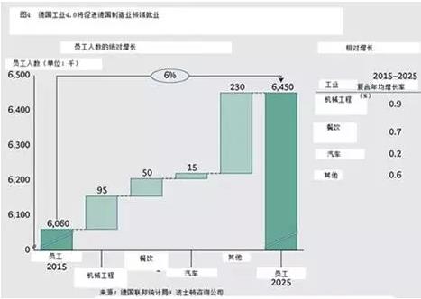就业方面。工业4.0将使德国在未来五年内就业增长6%。(如图4)在同一时期,机械工程部门对员工的需求可能会上升10%之多。然而,也会因此需要会不同技术的人。在短期内,自动化的趋势将取代一些操作简单、重复率高的低技能的工。同时,软件、连接和分析越来越多地被使用,将增加对软件开发和相关技术员工的需求。