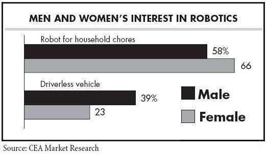 另一方面,过半数的消费者表示很有兴趣让机器人帮忙处理相对非个人化的家务杂事、照看花园及家庭安全监控。2014年,消费者对自动家庭安全监控的兴趣上升至59%,对机器人照看草坪及花园的兴趣从2013年的46%上升至2014年的56%。对机器人处理室内家务杂事的兴趣2014年则增长了3个百分点至62%。