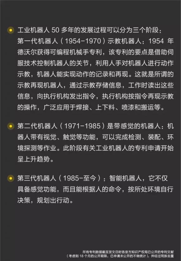 1. 全球工业机器人专利申请量超过9万件,经历了示教机器人、知觉机器人,现在进入智能机器人时代。