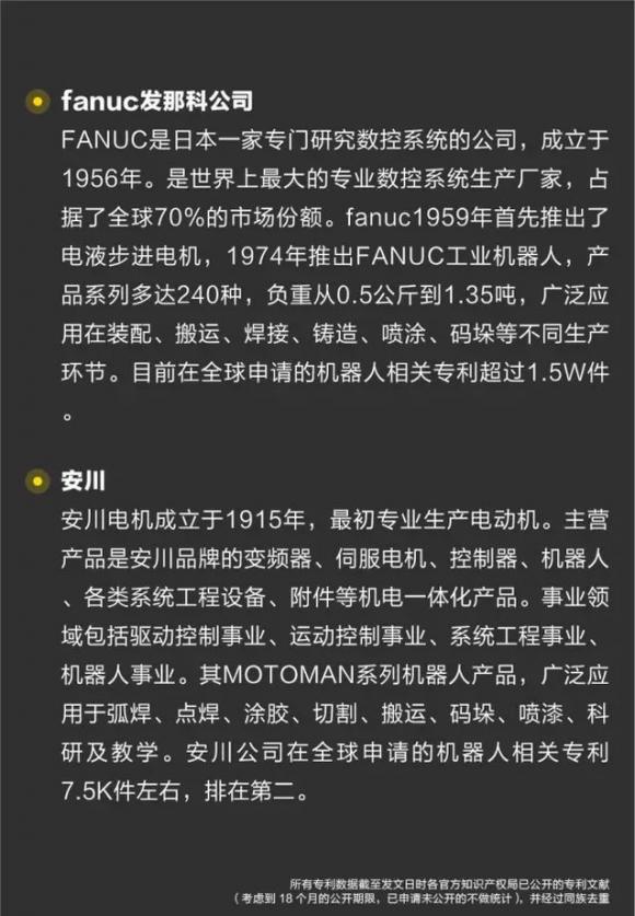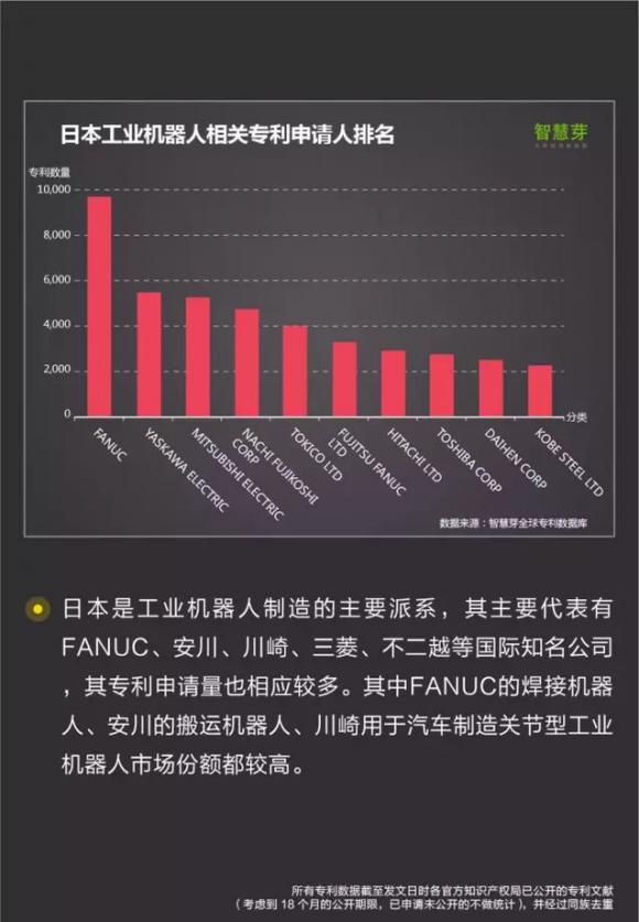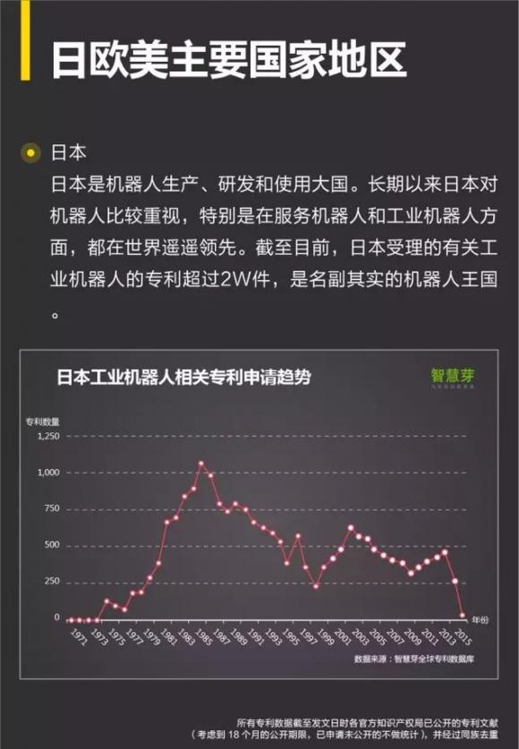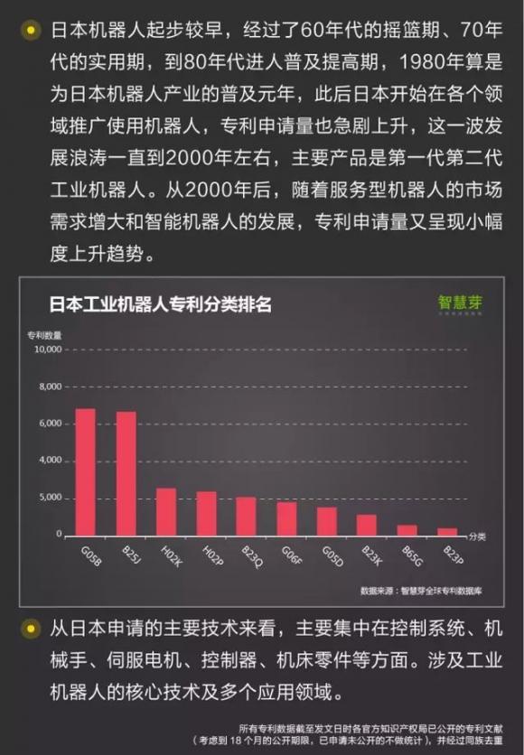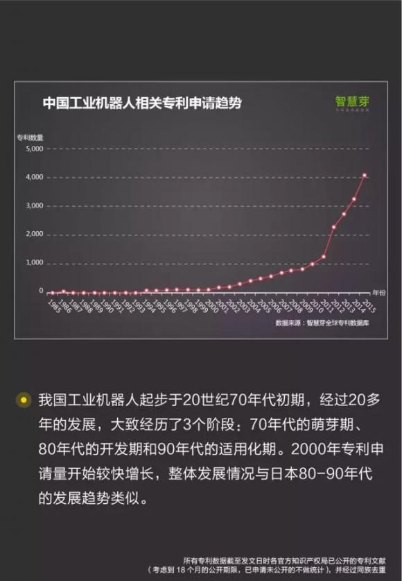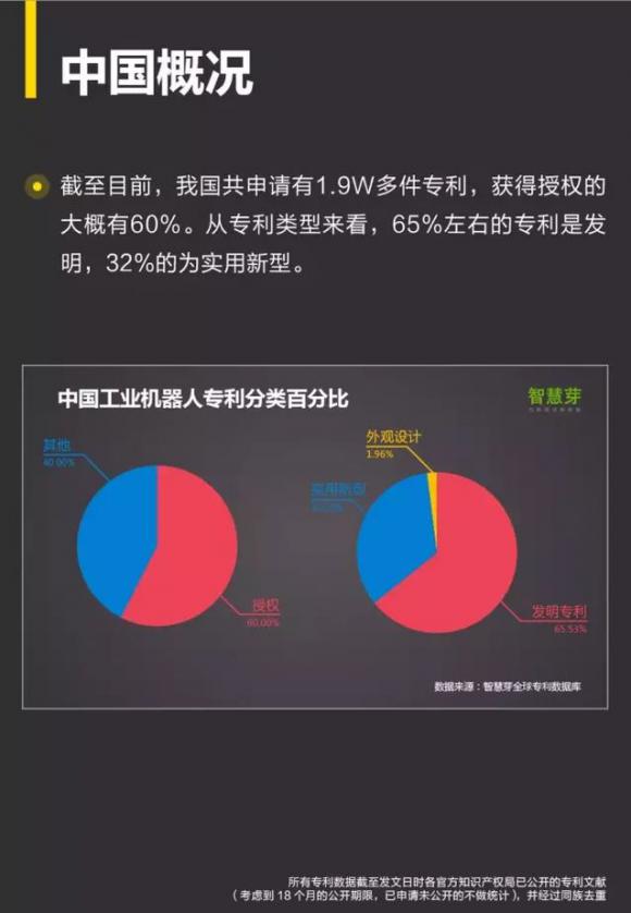 摘要:中国的工业机器人起步较晚,但发展较快,其与日本80-90年代工业机器人的发展历程相似,目前相关专利申请有1.9W多件专利,65%的为发明专利。