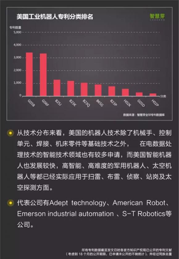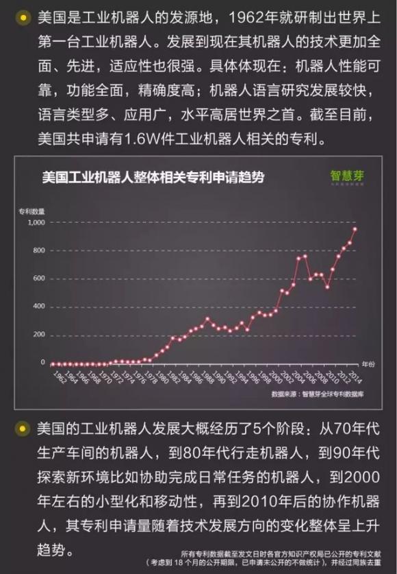 3. 美国是工业机器人的发源地,1962年就研制出世界上第一台工业机器人,目前共申请有1.6W件工业机器人相关的专利。
