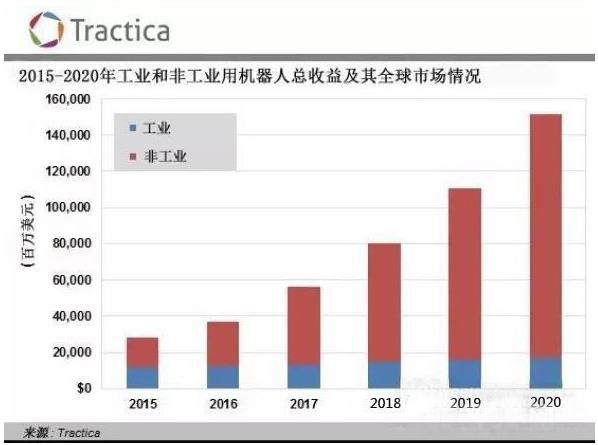 图1:Tractica报道了2015-2016年,总的工业和非工业用机器人收益及其全球市场情况